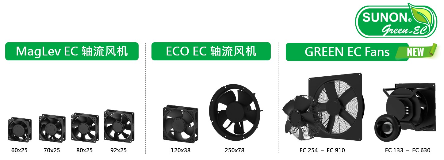 SUNON高效節(jié)能EC風扇將DC風扇直流馬達及轉速控制功能,直接應用于交流電源輸入環(huán)境,并擁有節(jié)能與智慧控制等優(yōu)勢,SUNON高效節(jié)能EC風扇依據不同產業(yè)應用共分為三大系列,小型的MagLev EC、Eco EC 系列,與大型的Green EC 系列。