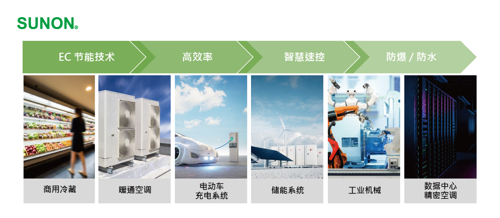 商用冷藏、暖風空調、電動車充電系統(tǒng)、儲能系統(tǒng)、工業(yè)機械、精密空調(數據中心)